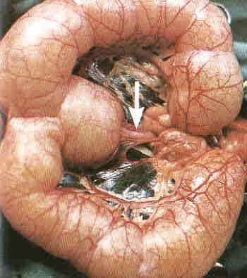 Eine Gebärmuttervereiterung tritt bei älteren Hündinnen relativ häufig ca. 8 Wochen nach einer Läufigkeit auf. Hormone verursachen eine Schwellung der Gebärmutterschleimhaut; Bakterien dringen dann in dieses schwammartige Gewebe ein und produzieren Eiter. Ist der Gebärmuttermund offen, so läuft der Eiter aus der Scheide, ist er geschlossen (Pfeil) so sammelt sich der Eiter in der Gebärmutter bis sie platzt.