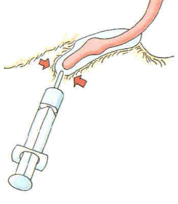 Nach Einführen einer geeigneten Spritze in die Vorhautöffnung wird die Vorhaut über dem Spritzenansatz festgehalten (roter Pfeil). Die desinfizierende Flüssigkeit wird nach hinten massiert. Nach Freigabe der Öffnung läuft die Spülflüssigkeit wieder heraus.