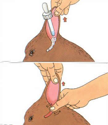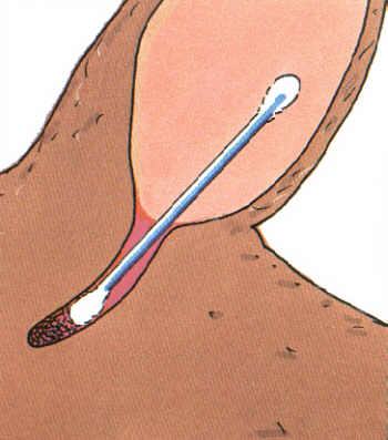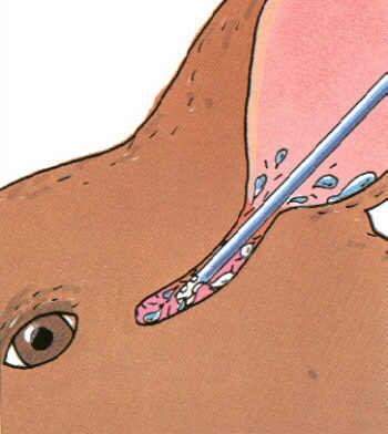 Der mit Flüssigkeit gefüllte Gehörgang wird zwischen Daumen und Finger genommen und massiert. Das Sekret löst sich und kann im oberen Teil des Gehörgangs mit um den Finger gewickelter Watte entfernt werden.